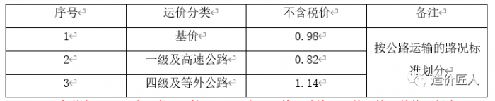 注:如增加運距影響因素,可按20km以內(nèi)和以外兩種情況調(diào)整,按照基價進(jìn)行上浮和下浮,浮動幅度參考0.1元/公里.噸。